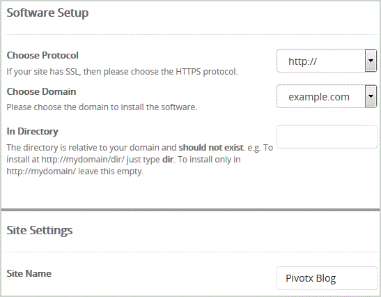 - In Directory: If you want to install this in a directory, for example example.com/directory, enter the directory name. Otherwise, leave this blank to install in your main domain example.com