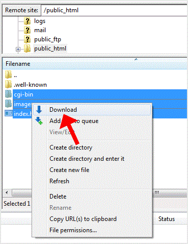3. In Right side box which is located below "Remote Site", Select files or folder .download. You can press "CTRL" babies and choose multiple folder/files and then press right click on file or folder you choosed and then click on "Download" babies.